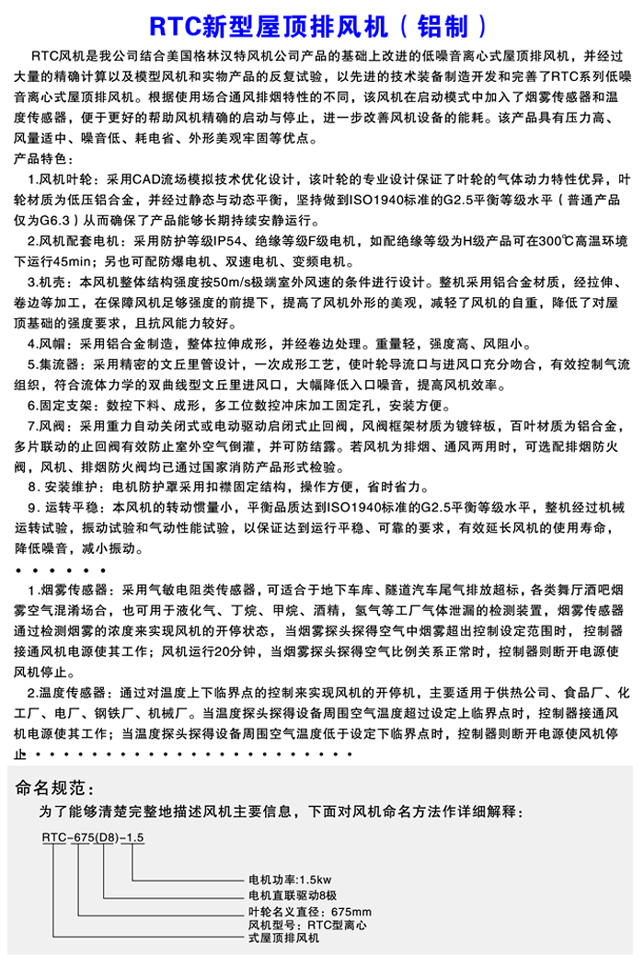 RTC铝制屋顶风机用途:屋顶排风、风管集中排风、防爆排风(仅限直联)风量范围:600~50000 m静压范围:100~750Pa驱动形式:皮带驱动、直联驱动安装形式:屋顶泛水安装产品特点:经过AMCA认证产品;全铝制重量轻,减少屋顶载荷;翔欣2代叶轮,效率高,不过载;平衡等级高达G2.5,减少噪音和振动;主动冷却驱动机构,延长电机寿命;外形美观精致,提升设计品味。